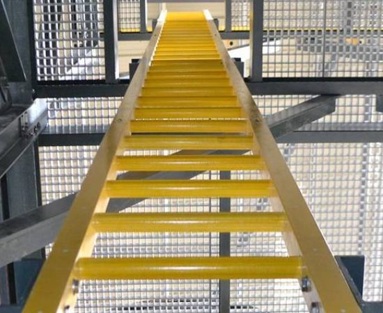 تُنتج السلالم الثابتة المصنوعة من البلاستيك المقوى بالألياف الزجاجية (FRP) باستخدام عملية بلمرة عالية الحرارة